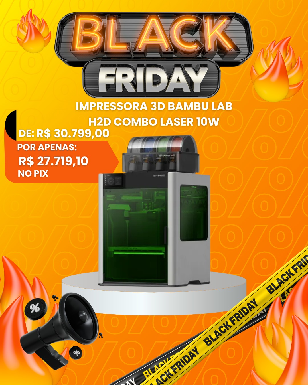 Projetado para suportar desde materiais flexíveis até compostos reforçados com fibra, o H2D opera em alta velocidade com seu hotend de 350°C e câmara aquecida, mantendo qualidade profissional mesmo em projetos complexos e de grande escala. Com recursos como compensação ativa de vibração, monitoramento por IA, sistema de segurança a laser e conectividade com nuvem (ou isolamento total offline), ele oferece potência, segurança e inteligência em um só equipamento.